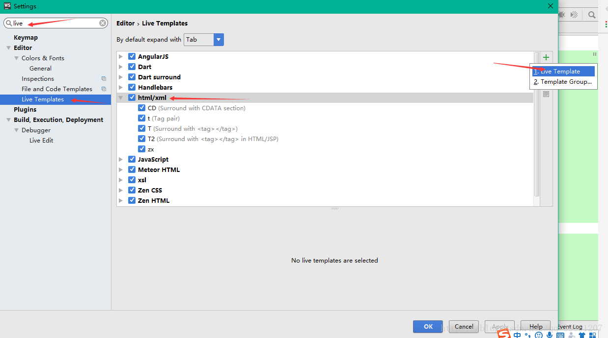 2)在搜索框中输入live→live Templates→html/xml,点击右边绿色的加号,选择第一个live Templates