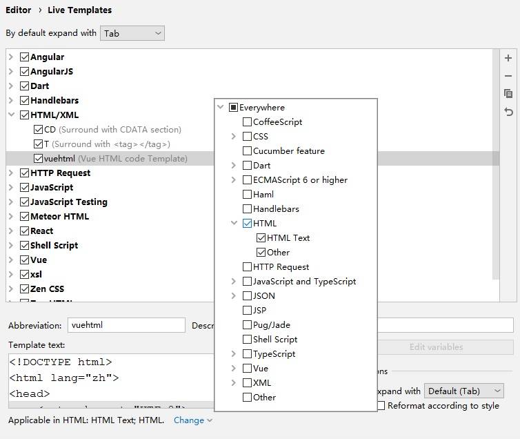 3)在Abbreviation那一行填上自己设置的快捷键(比如:vuehtml),在Template text框中复制上面那段代码片段,然后点击最下面一行景红色的Define,选则HTML,最后apply→ok。