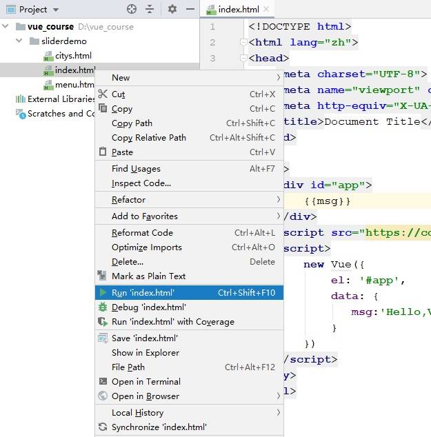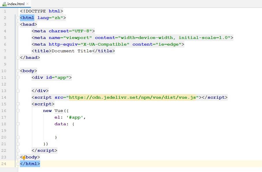 4)测试。 新建一个index.html的空白页面,输入vuehtml快捷键,按下tab键。则迅速生成vue页面框架。如下所示: