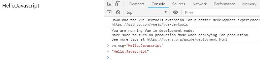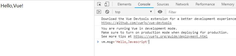 我们已经成功创建了第一个 Vue 应用!看起来这跟渲染一个字符串模板非常类似,但是 Vue 在背后做了大量工作。现在数据和 DOM 已经被建立了关联,所有东西都是响应式的。我们要怎么确认呢?打开你的浏览器的 JavaScript 控制台 (就在这个页面打开),并修改 vm.msg 的值,你将看到上例相应地更新。