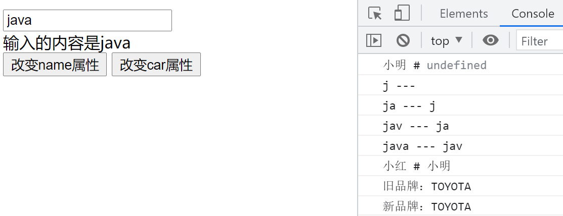 //当点击改变数据的时候,后台打印 小红 # 小明