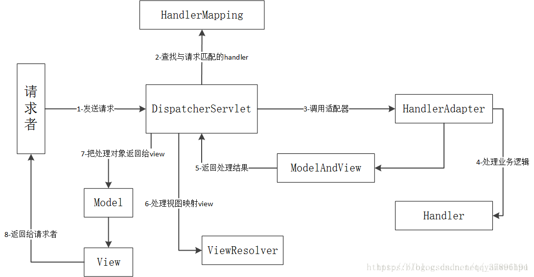 在上图中包含 4 个 Spring MVC 接口,即 DispatcherServlet、HandlerMapping、Controller 和 ViewResolver。