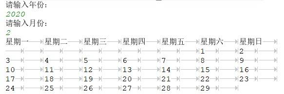 用户在控制台输入年份和月份,在控制台显示该月的日历。