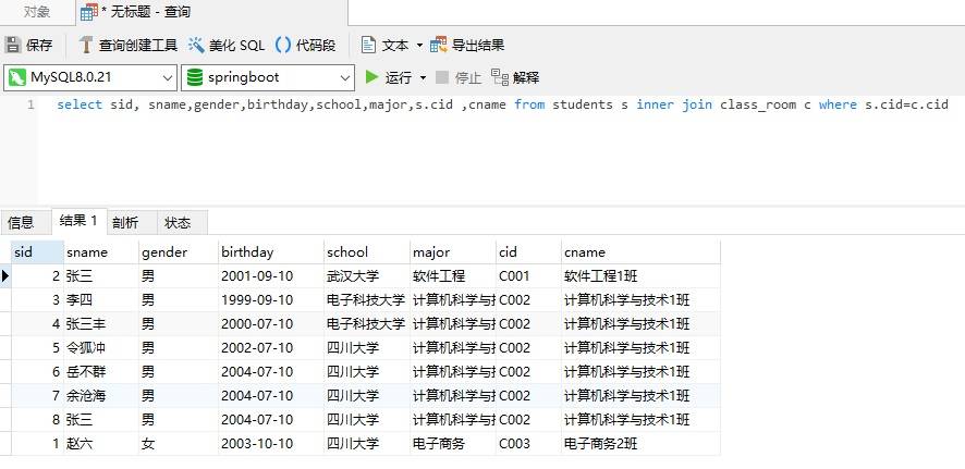 value="select sid, sname,gender,birthday,school,major,s.cid ,cname from students s inner join class_room c where s.cid=c.cid")