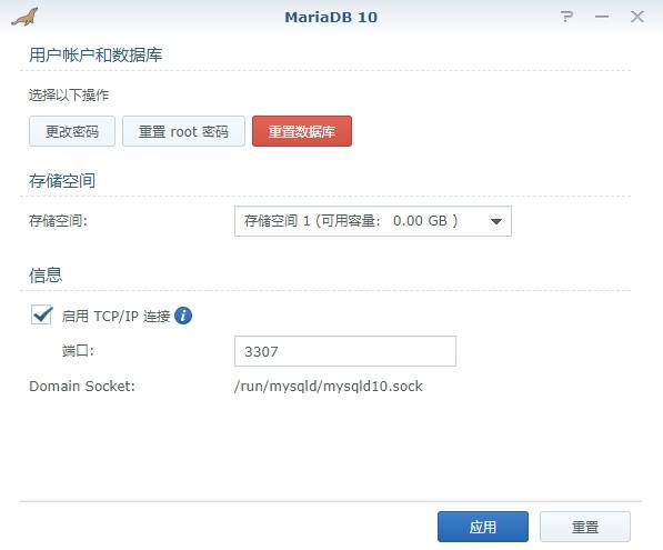 1.在套件中心选中Maria DB10安装。 在套件中心选中Maria DB10安装,自动安装完成后,开启TCP连接,开放3307端口,如下图所示。