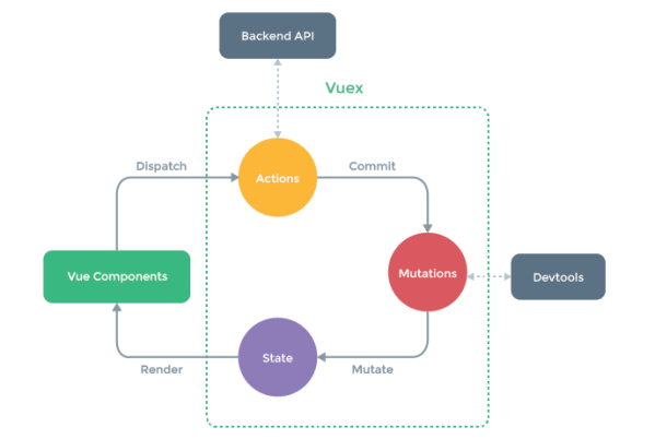 State:存储状态数据 Getter:从状态数据派生数据,相当于State的计算属性。 Mutation:存储用于同步更改状态数据的方法,默认传入的参数为state。 Action:存储用于异步更改状态数据,但不是直接更改,而是通过触发Mutation方法实现,默认参数为context。 Module:Vuex模块化。