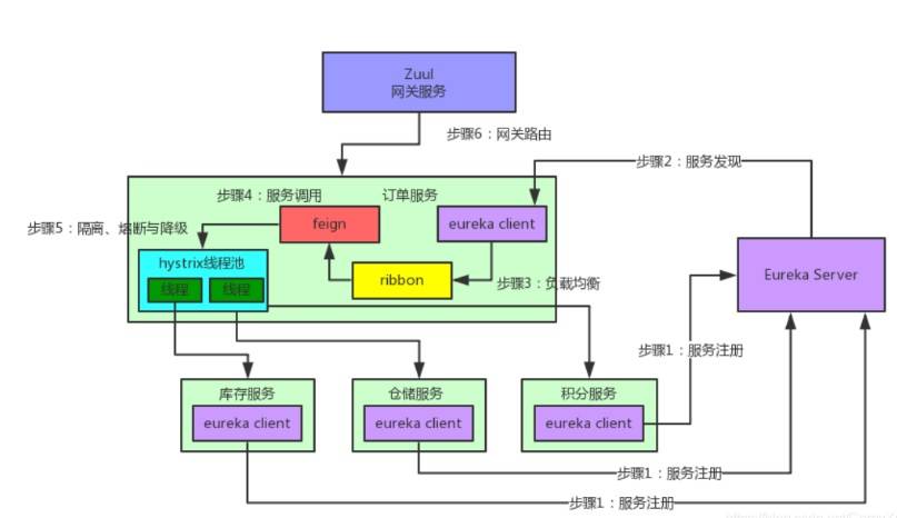 Spring Cloud的5个核心组件通过一张图串联起来如下图: