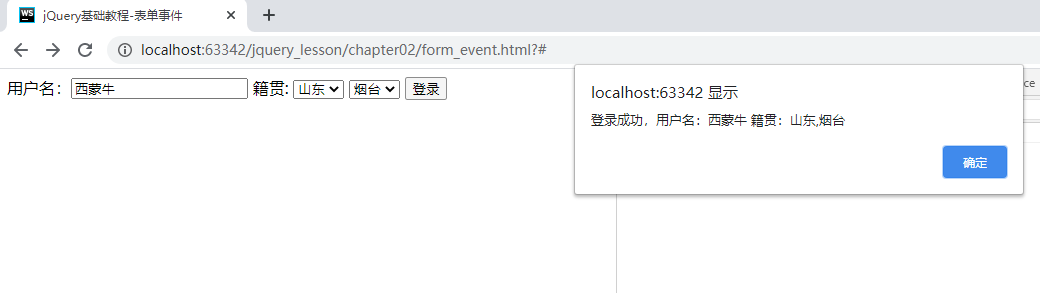 alert("登录成功,用户名:"+username+" 籍贯:"+provice+","+city);