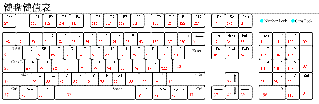keypress与keydown与keyup的主要区别: (1)对中文输入法不友好,无法响应中文输入; (2)无法响应系统功能键(比如delete,backspace); (3)由于前面两个限制,keyCode与keydown和keyup不是很一致;keypress的keyCode参照ASCII。而keydown与keyup的keyCode参照下图。