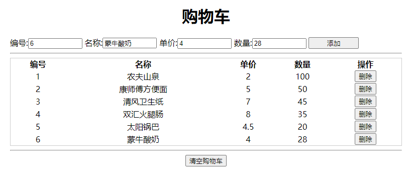 let html = "<tr><td>"+id+"</td><td>"+name+"</td><td>"+price+"</td><td>"+number+"</td><td><input type='button' value='删除' onclick='deleteItem(this)'></td></tr>";