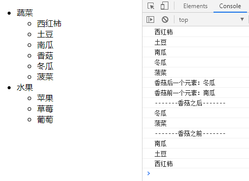 console.log( "香菇前一个元素:"+$("#mushroom").prev().text());