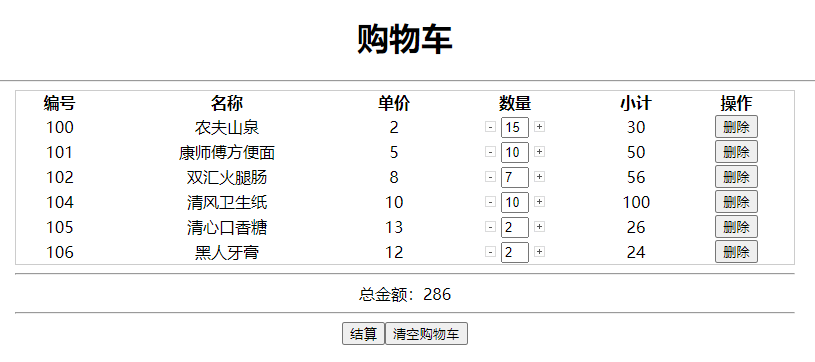<input type="button" value="结算" onclick="javascript:alert('去结算啰....');"/><input type="button" value="清空购物车" id="clear" onclick="clearCart()"/>