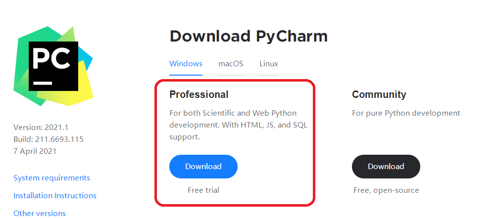 Pycharm有以下三个不同版本: