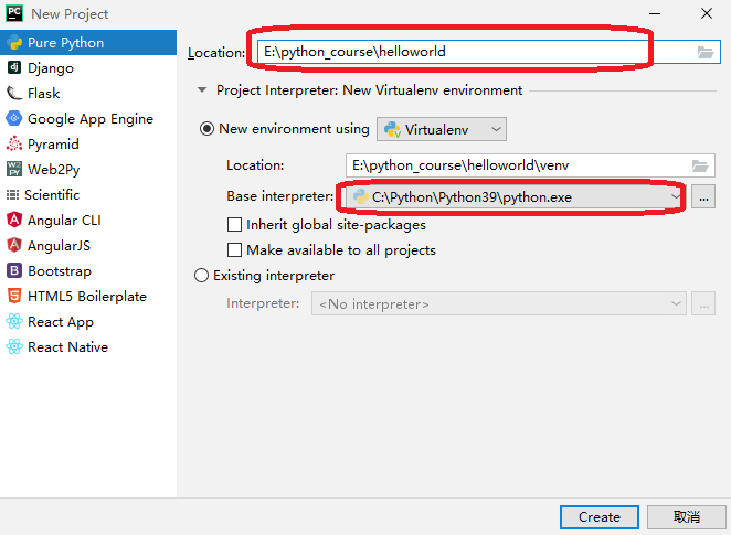 2.出现如下窗口,选择Pure Python,选择工程路径和编译器。