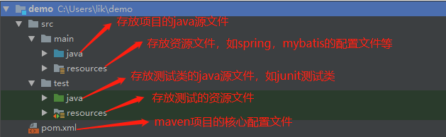 一个标准的maven项目目录结构见下表: |目录/文件|说明| |-|-| |src/main/java|Java源文件| |src/main/resource|资源文件| |src/main/webapp|Web应用程序源| |src/test/java|单元测试源文件| |src/test/resources|单元测试资源文件| |pom.xml|pom.xml主要描述了项目的maven坐标,包依赖关系。|