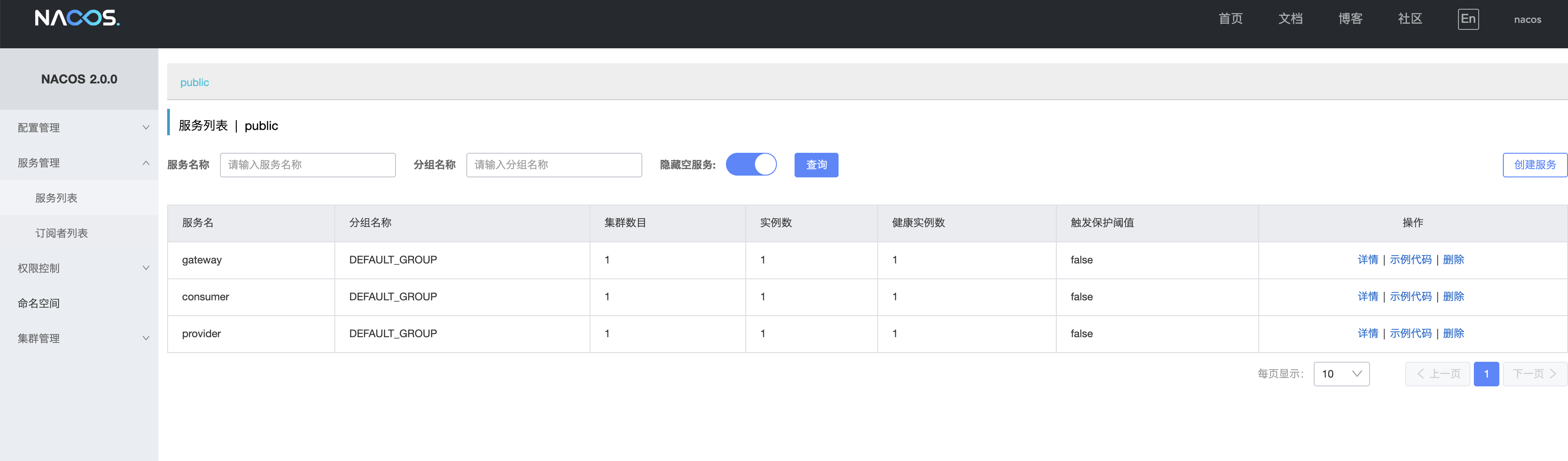 依次启动gateway\consumer\provider三个工程,在nacos中已经成功注册: