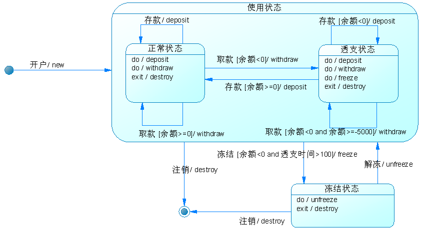 状态图实例: 某信用卡系统账户具有使用状态和冻结状态,其中使用状态又包括正常状态和透支状态两种子状态。如果账户余额小于零则进入透支状态,透支状态时既可以存款又可以取款,但是透支金额不能超过5000元;如果余额大于零则进入正常状态,正常状态时既可以存款又可以取款;如果连续透支100天,则进入冻结状态,冻结状态下既不能存款又不能取款,必须要求银行工作人员解冻。用户可以在使用状态或冻结状态下请求注销账户。根据上述要求,绘制账户类的状态图。