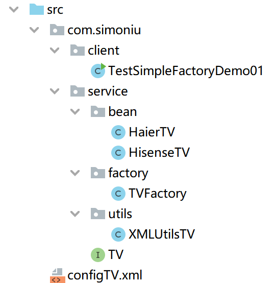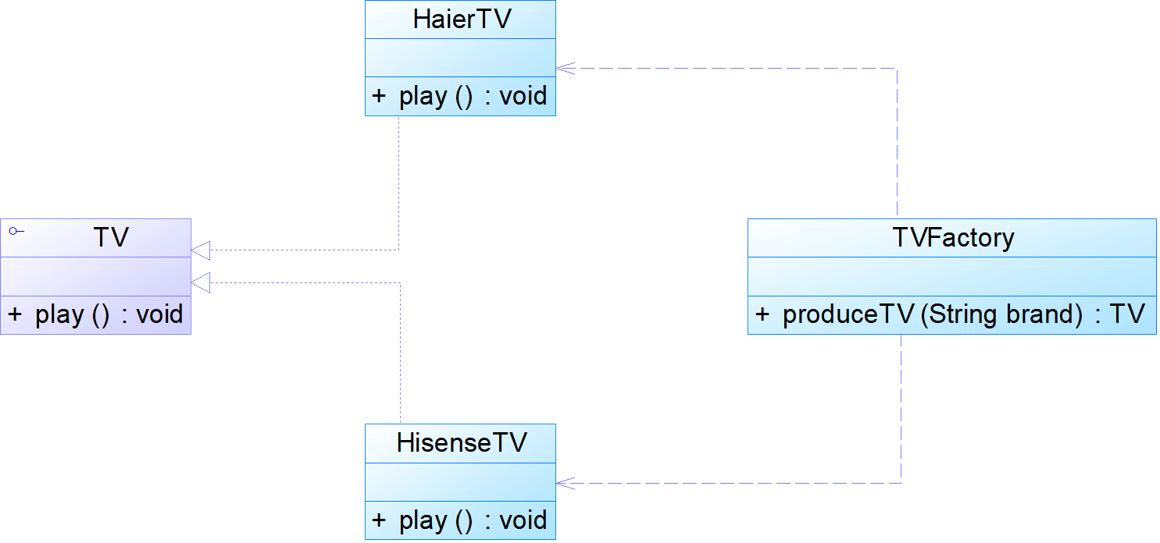 2.实例 某电视机厂专为各知名电视机品牌代工生产各类电视机,当需要海尔牌电视机时只需要在调用该工厂的工厂方法时传入参数“Haier”,需要海信电视机时只需要传入参数“Hisense”,工厂可以根据传入的不同参数返回不同品牌的电视机。现使用简单工厂模式来模拟该电视机工厂的生产过程。