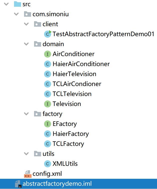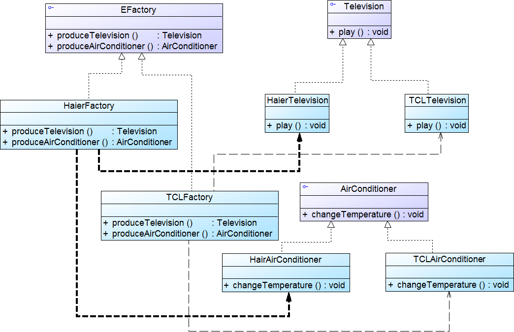 一个电器工厂可以产生多种类型的电器,如海尔工厂可以生产海尔电视机、海尔空调等,TCL工厂可以生产TCL电视机、TCL空调等,相同品牌的电器构成一个产品族,而相同类型的电器构成了一个产品等级结构,现使用抽象工厂模式模拟该场景。