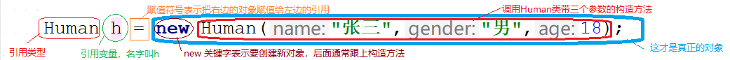 我们把Human h = new Human("张三","男",18);这句话以庖丁解牛的方式分解开来,包含以下几个部分,如图所示: