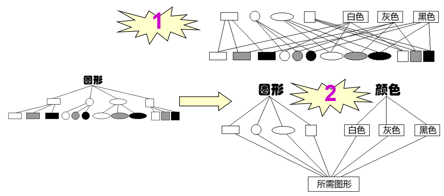 设想如果要绘制矩形、圆形、椭圆、正方形,我们至少需要4个形状类,但是如果绘制的图形需要具有不同的颜色,如红色、绿色、蓝色等,此时至少有如下两种设计方案: