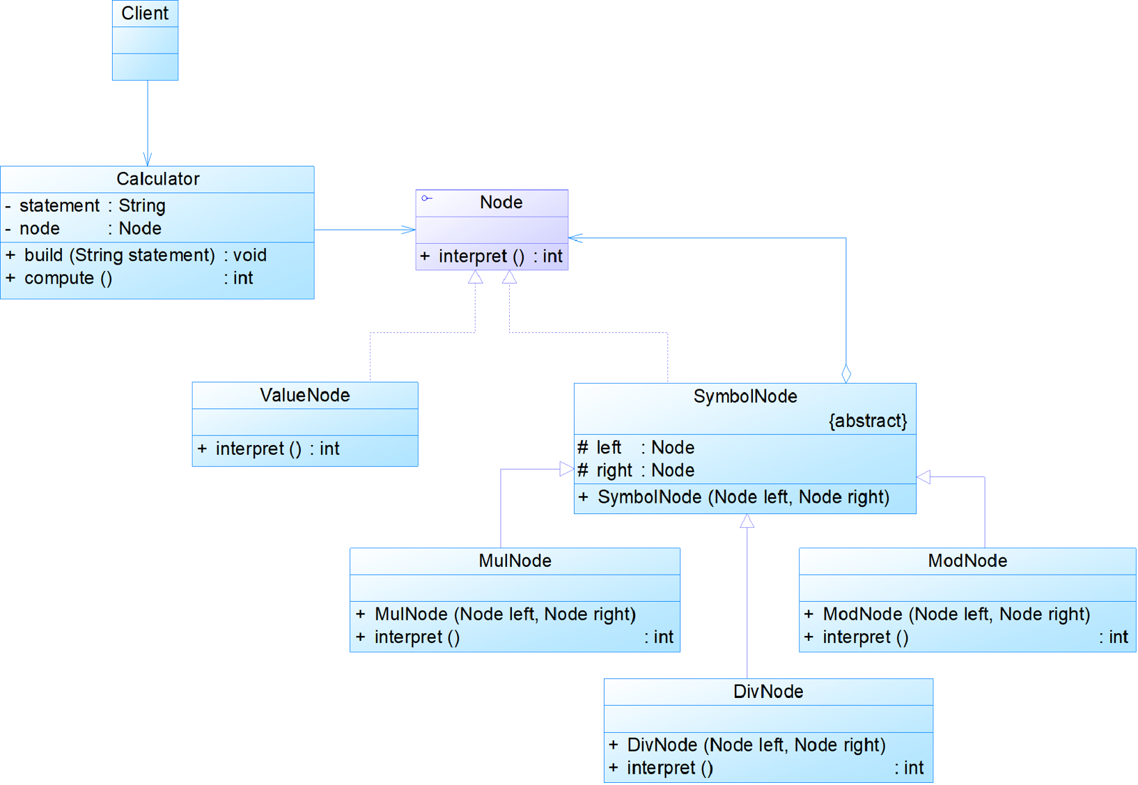 1. 解释器模式 如果在系统中某一特定类型的问题发生的频率很高,此时可以考虑将这些问题的实例表述为一个语言中的句子,因此可以构建一个解释器,该解释器通过解释这些句子来解决这些问题。
