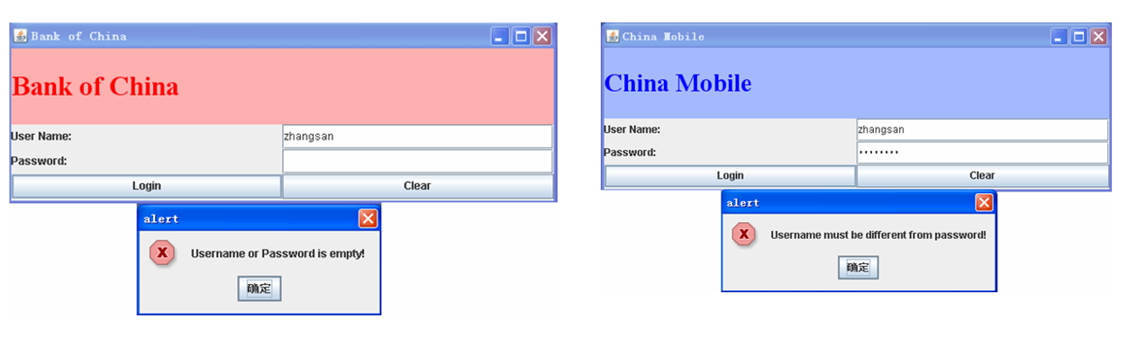 自定义登录控件,中国银行登录控件要求用户名和密码不能为空。中国移动登录控件要求用户名和密码必须不同。