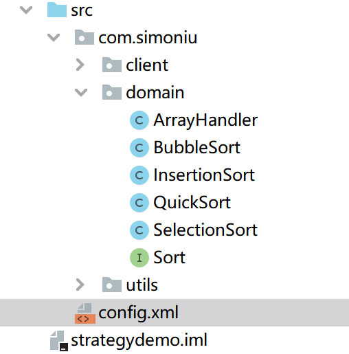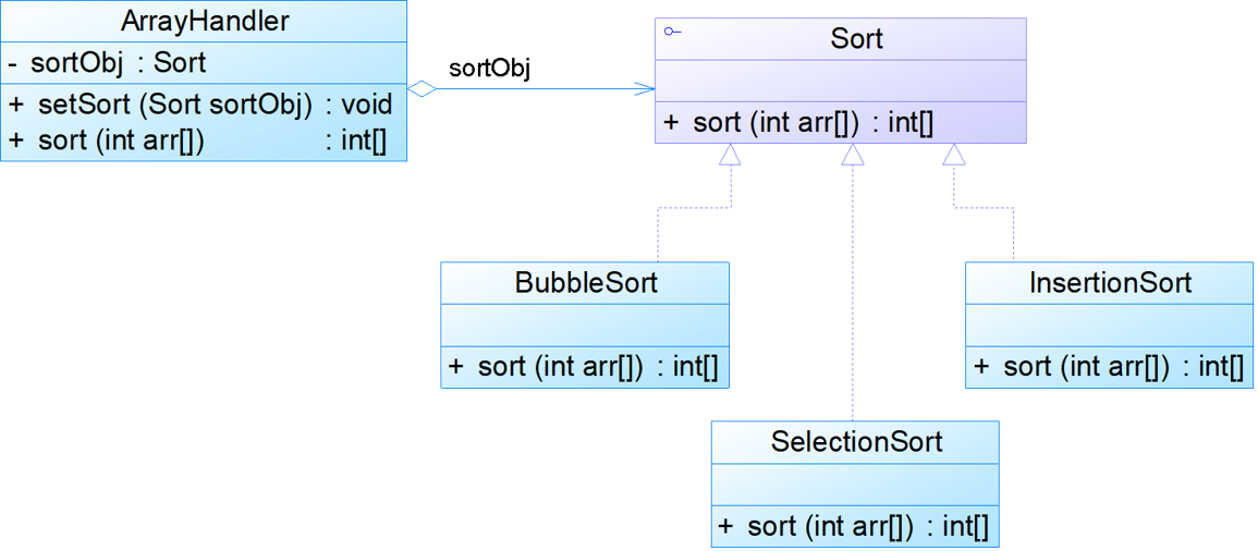 某系统提供了一个用于对数组数据进行操作的类,该类封装了对数组的常见操作,如查找数组元素、对数组元素进行排序等。现以排序操作为例,使用策略模式设计该数组操作类,使得客户端可以动态地更换排序算法,可以根据需要选择冒泡排序或选择排序或插入排序,也能够灵活地增加新的排序算法。