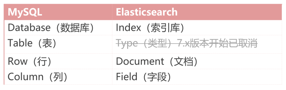名词解释: - MySQL中有Database(数据库)的概念,对应的在ES中有Index(索引库)的概念。 - MySQL中有Table(表)的概念,对应的在ES中有Type(类型)的概念,不过需要注意,ES在1.x~5.x版本中是正常支持Type的,每一个Index下面可以有多个Type。从6.0版本开始,每一个Index中只支持1个Type,属于过渡阶段。从7.0版本开始,取消了Type,也就意味着每一个Index中存储的数据类型可以认为都是同一种,不再区分类型了。 - MySQL中有Row(行)的概念,表示一条数据,在ES中对应的有Document(文档)。 - MySQL中有Column(列)的概念,表示一条数据中的某个列,在ES中对应的有Field(字段)。