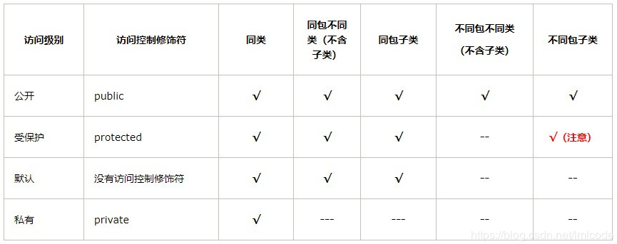 四个访问修饰符的访问权限如下图所示: