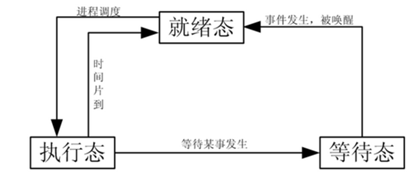 就绪态:进程已经具备执行的一切条件,正在等待分配 CPU 的处理时间。 执行态:该进程正在占用 CPU 运行。 等待态:进程因不具备某些执行条件而暂时无法继续执行的状态。