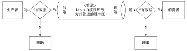每个管道只有一个页面作为缓冲区,该页面是按照环形缓冲区的方式来使用的。这种访问方式是典型的“生产者——消费者”模型。当“生产者”进程有大量的数据需要写时,而且每当写满一个页面就需要进行睡眠等待,等待“消费者”从管道中读走一些数据,为其腾出一些空间。相应的,如果管道中没有可读数据,“消费者” 进程就要睡眠等待,具体过程如下图所示: