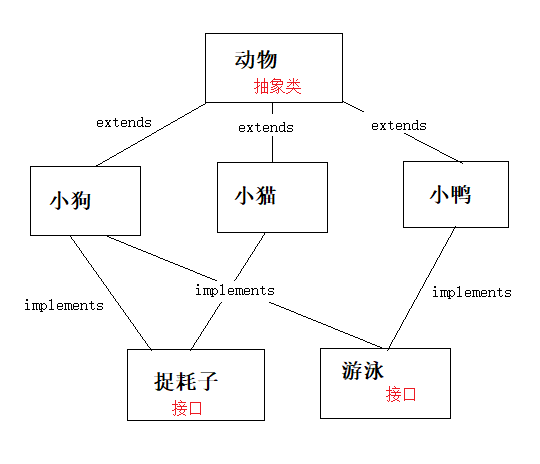 我们分别设计了动物、小猫、小狗、小鸭、老鼠类。 分析得到,小狗、小猫、小鸭、老鼠都是动物,所以动物应该设计为抽象类。小猫和小狗都有捉耗子的本领,所以让小狗和小猫都去实现捉耗子接口,而小鸭和小狗都有游泳的本领,所以让小狗和小鸭都去实现游泳的接口。