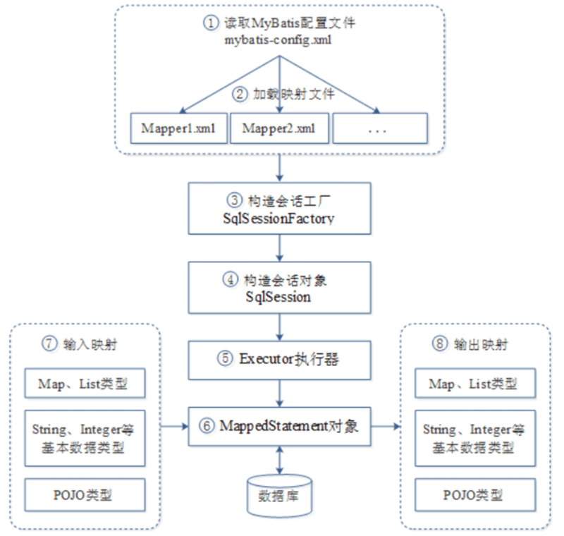 从上图可以看出,MyBatis框架在操作数据库时,大体经过了8个步骤。下面就对图中的每一步流程进行详细讲解,具体如下。