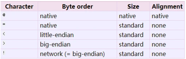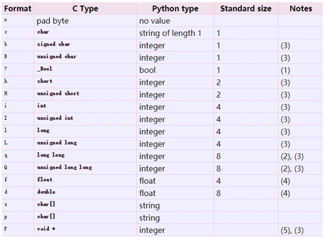 struct 最常用的方法有两个: - struct.pack(fmt,v1,v2,…) 返回的是一个字符串,是参数按照fmt数据格式组合而成。 - struct.unpack(fmt,string) 按照给定数据格式解开(通常都是由struct.pack进行打包)数据,返回值是一个tuple。