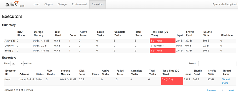 Executors选项卡提供了关于内存、CPU核和其他被Executors使用的资源的信息。这些信息在Executor级别和汇总级别都可以获取到。一方面通过它可以看出来每个excutor是否发生了数据倾斜,另一方面可以具体分析目前的应用是否产生了大量的shuffle,是否可以通过数据的本地性或者减小数据的传输来减少shuffle的数据量。