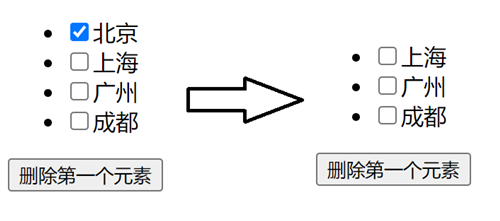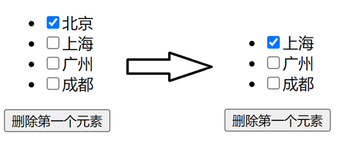 我们发现此时'北京'已经删除了,但是'上海'默认选中,显然是不合理的。这是因为Vue,默认使用“就地更新”的策略。如果数据项的顺序被改变,Vue将不会移动DOM元素来匹配数据项的顺序,而是就地更新每个元素,并且确保它们在每个索引位置正确渲染,要选择适合的属性作为key。