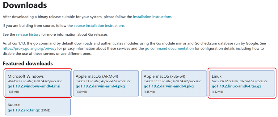 官网安装包下载地址为:https://golang.org/dl/。 由于Go语言是Google公司研发的,国内用户可能无法访问,可以使用这个镜像地址:https://golang.google.cn/dl/。