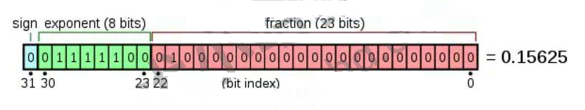 float32,即我们常说的单精度,存储占用4个字节,也即4*8=32位,其中1位用来符号,8位用来指数,剩下的23位表示尾数: