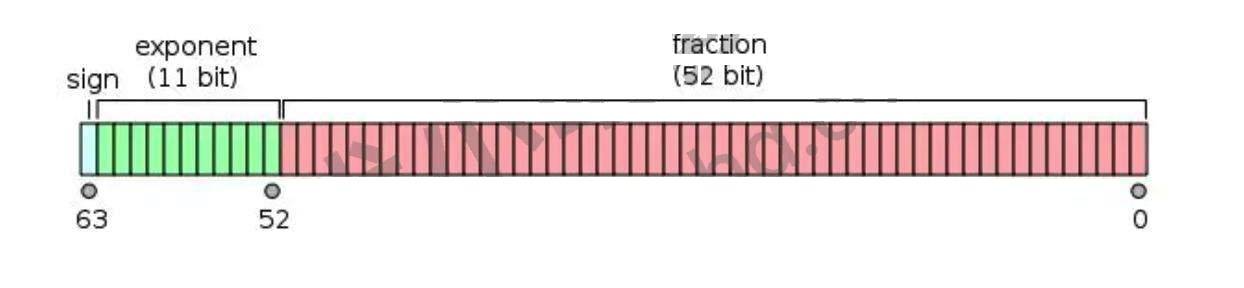 float64, 即我们熟悉的双精度,存储占用8个字节,也即8*8=64位,其中1位用来符号,11位用来指数,剩下的52位表示尾数: