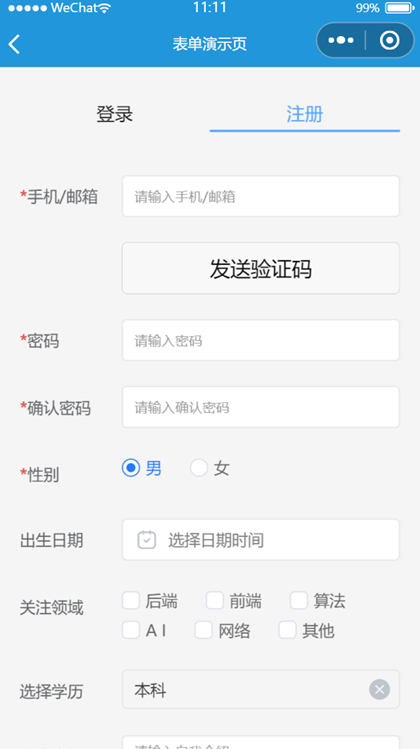 使用uni-ui的表单组件实现登录和注册表单界面效果。