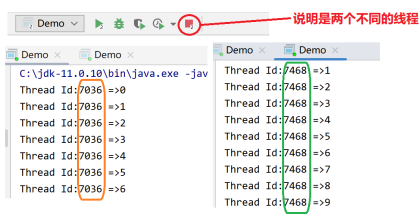 我们发现两个不同的线程,它们的线程ID和线程名字居然完全相同!这就说明Thread.currentThread().getId();获得的并不是真正的线程ID,很有可能是JVM内部动态分配的ID。