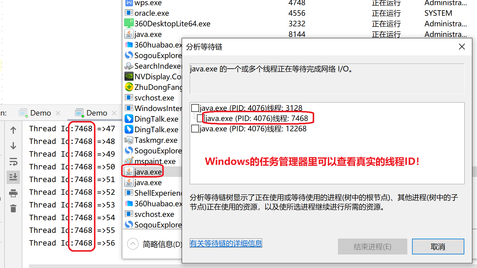 这次我们发现两个不同的线程,具有真正意义上不同的线程ID。为了进一步验证,程序获得就是操作系统真实的线程ID,我们拿程序输出的结果与windows的任务管理器里查看的线程ID进行对比,结果完全一致!
