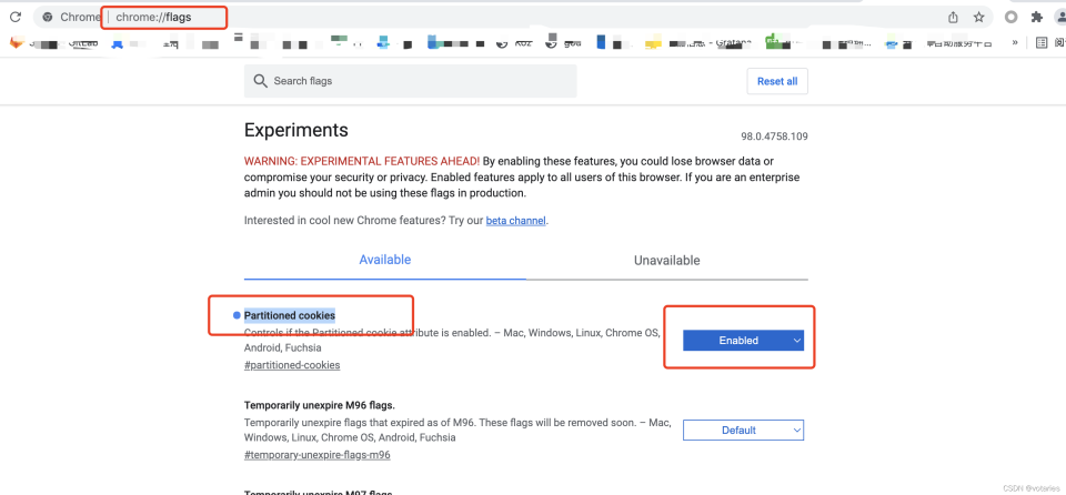 最新版的chrome浏览器已经无法手动设置Cookie。需要在谷歌浏览器中搜索chrome://flags/,搜索Partitioned cookies ,改为Enabled。