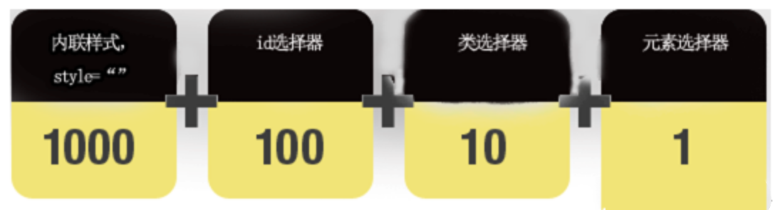 Css选择器分为4个等级,每个等级代表一类选择器,每个等级的值为其所代表的选择器的个数乘以这一等级的权值。如下图所示:
